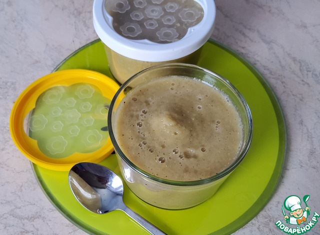 Фрукты пюрировать блендером, добавить к набухшим хлопьям, добавить кленовый сироп и взбить все блендером. При необходимости кленового сиропа можно добавить еще.