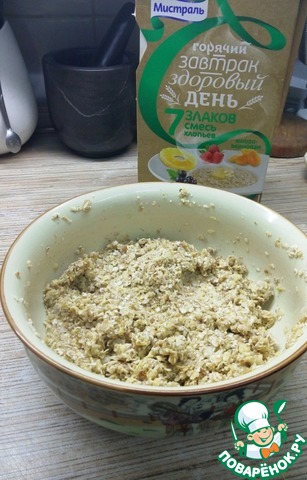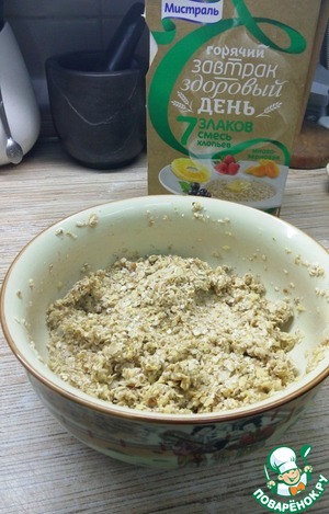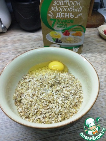 Отмерить нужное количество хлопьев, добавить подслащенную воду, яйцо, перемешать тщательно и оставить на 10 минут, чтобы хлопья набухли.