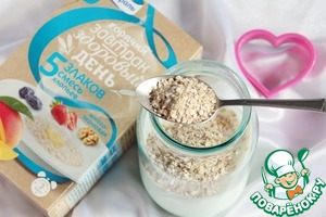 В кефир или йогурт добавить злаковую смесь хлопьев торговой марки "Мистраль" и сахар ванильный.