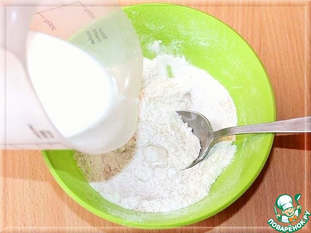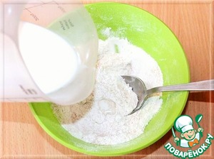Влейте тонкой струйкой в сухую смесь 150 мл теплого молока, хорошо размешайте. Накройте миску полотенцем и поставьте опару в теплое место на 30 минут.