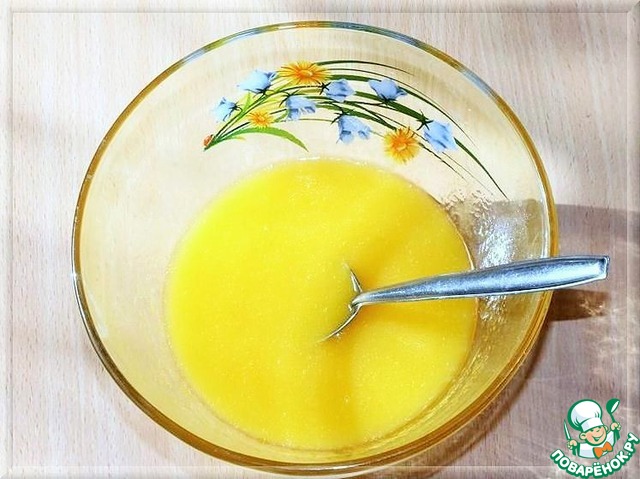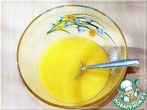 В растопленное, остуженное масло (100 г) добавить сахар (75 г), 2 яйца,
