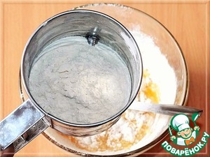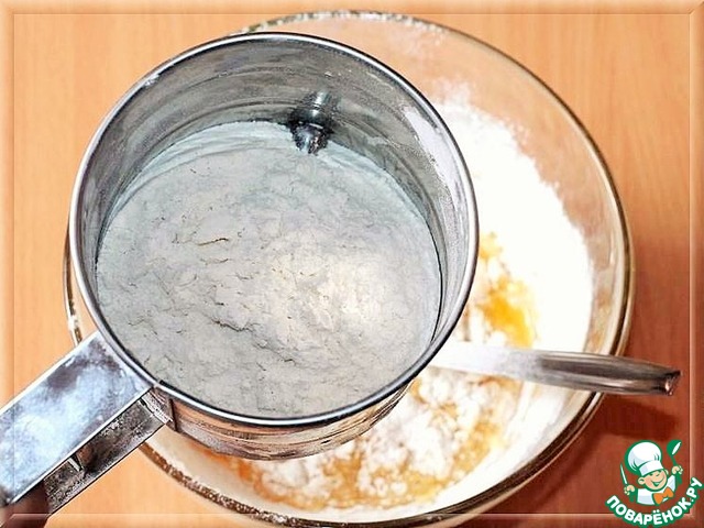 смешанную просеянную муку (450 г), соль (0,5 ч. л. ), ваниль и опару.