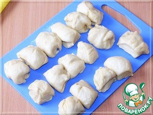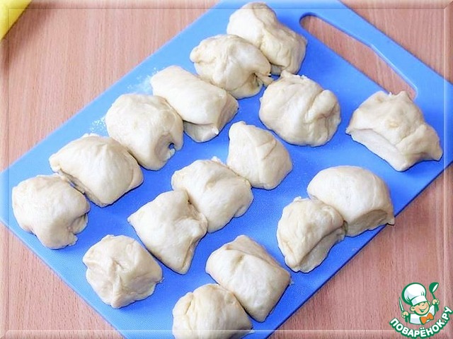 Приготовим булочки. Выложить подошедшее тесто на припыленную мукой поверхность. Разделите его пополам, потом каждую половинку еще раз пополам, до тех пор, пока у вас не получится 16 кусочков.