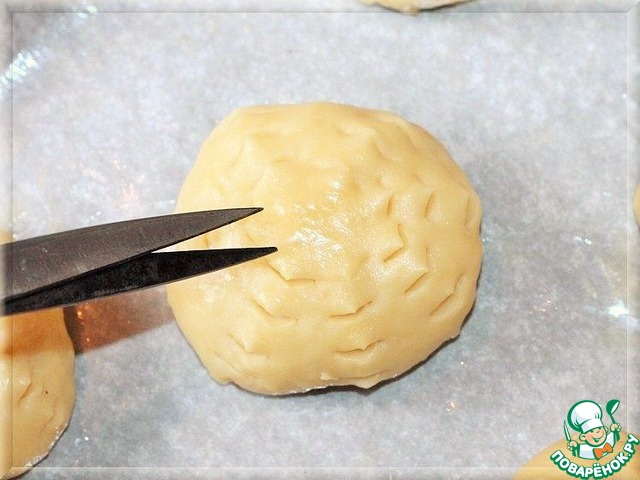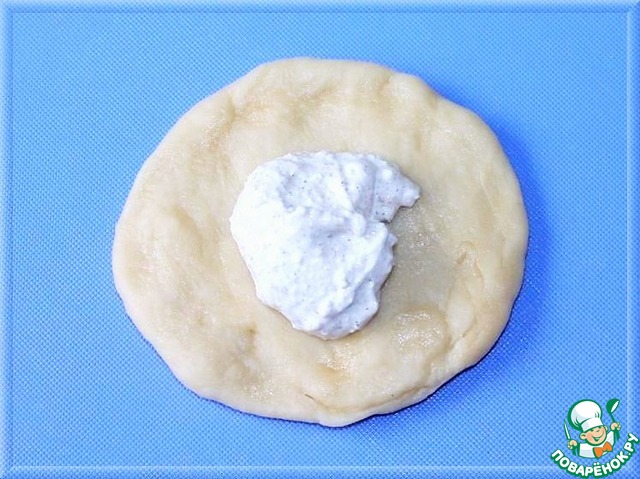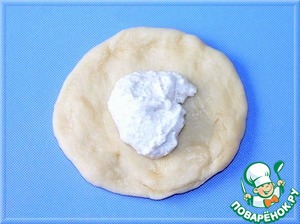 Руками берем кусочек теста и раскатываем его в круг толщиной 1 см. В середину кружочка кладем 1 ч. л. творожной начинки,