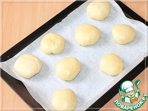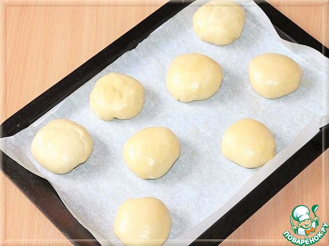 Форму для выпечки выстелить бумагой, смазать подсолнечным маслом и выложить булочки на небольшом расстоянии друг от друга.