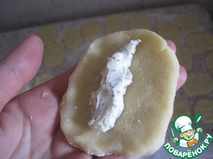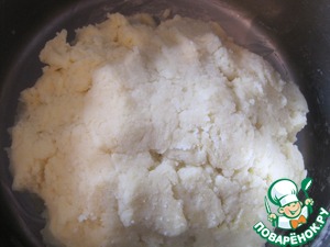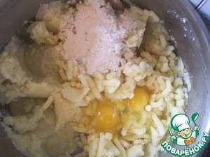 Отварной картофель разминаем, охлаждаем, добавляем яйца, муку