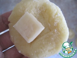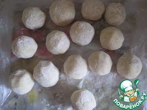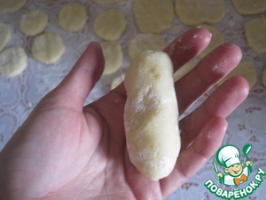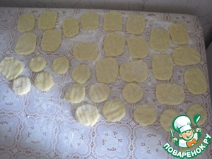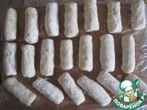 Для крокетов формуем прямоугольники из картофельного теста и укладываем на подпыленный стол с мукой (их получилось 20 шт), для шариков -кружочки (15 шт)