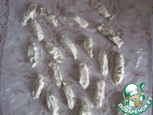 При помощи 2 ложек формуем колбаски, укладываем на пленку и ставим в морозильник