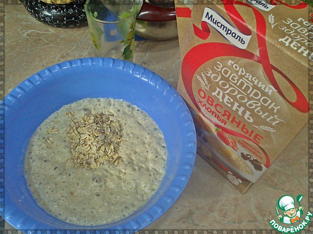 В опару добавить овсяные хлопья, растительное масло и постепенно добавляем просеянную муку. У меня на замес ушло 180г муки, ориентируйтесь по своей муке.