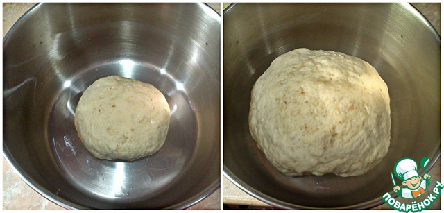 Тесто положить в емкость, смазанную растительным маслом и поставить в тепло на 1 час. Тесто увеличилось в два раза.