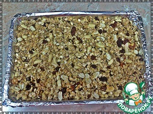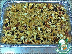На противень, застеленный фольгой или пергаментной бумагой, выложить нашу гранолу и равномерно ее распределить. Подсушиваем гранолу в заранее разогретой духовке 40 минут при температуре 170 градусов, не забывая при этом периодически помешивать, чтоб гранола равномерно подсушивалась. Если у Вас застелено фольгой, мешайте аккуратно, чтоб не порвалась фольга. По истечении 40 минут духовку отключите и оставьте гранолу внутри до полного остывания.