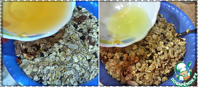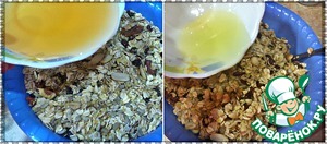 Мед хорошо перемешать с водой и влить в гранолу. Затем влить оливковое масло (можно растительное без запаха) и тщательно перемешать.