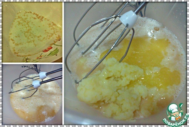 Яйца (2шт) взбить с сахаром и солью, добавить растопленное масло, картофельное пюре, перемешать до однородной массы и соединить с дрожжами. -