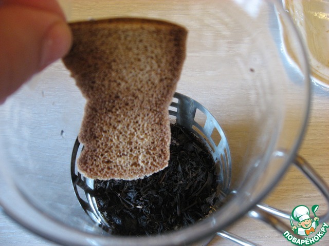 В любую емкость (у меня френч-пресс) насыпаем чай и кладем корочку хлеба (верхнюю темную корочку)