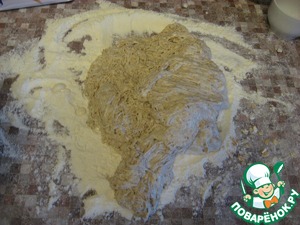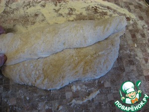 По прошествии времени на обильно посыпанный мукой стол выкладываем тесто, обминаем его хорошо и формуем хлеб. В оригинальном рецепте предлагалось испечь его в форме, я решила сделать ввиде батона. Из этого кол-ва выйдет два батона.