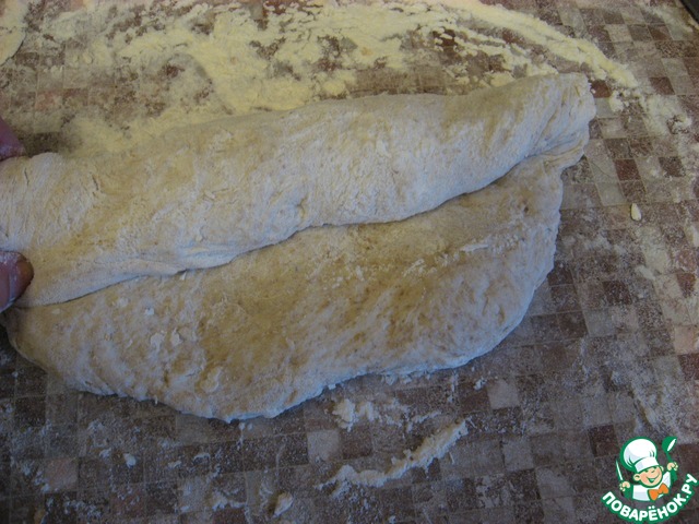 Итак, делим тесто на 2 части. Слегка раскатываем одну из низ в овальную лепешку и скручиваем рулетиком. Кладем на противень швом вниз -