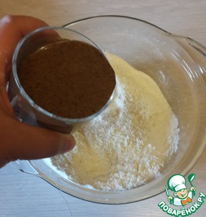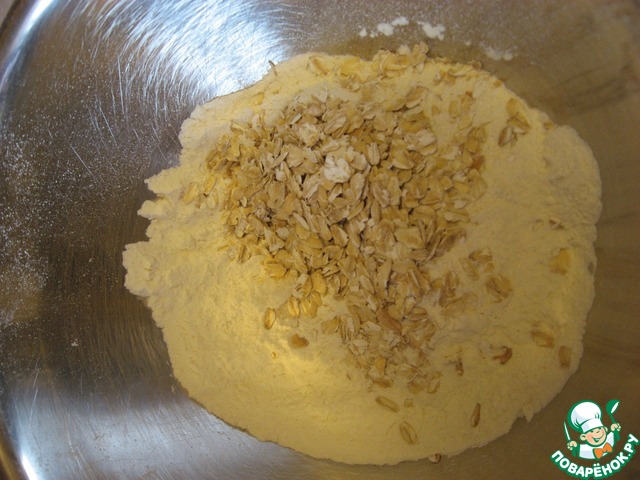 В миску просеиваем 500 г муки, смешиваем её с солью и сухими дрожжами, добавляем овсяные хлопья, перемешиваем