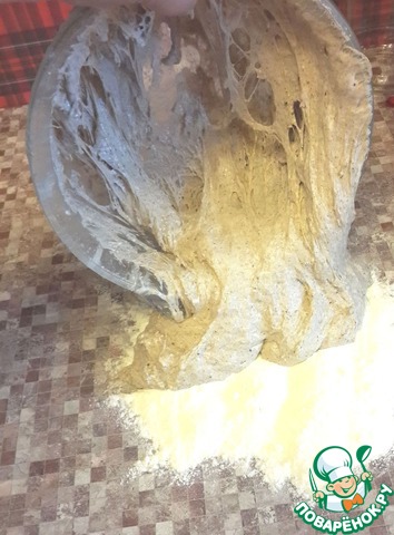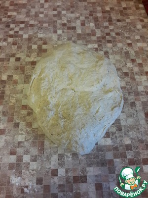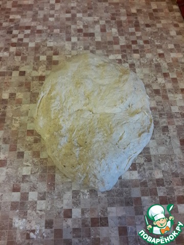 Оставшиеся 200 г муки насыпаем на стол, выкладываем тесто и хорошо обминаем его. Мука вся войдет в тесто