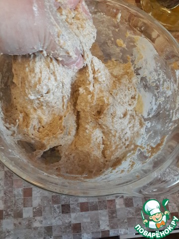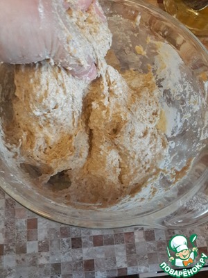 Я замесила первоначально тесто с 500 граммами и, уже добавив при вымешивании только 100 грамм, вижу, что надо останавливаться, потому что тесто получается слишком крутым.