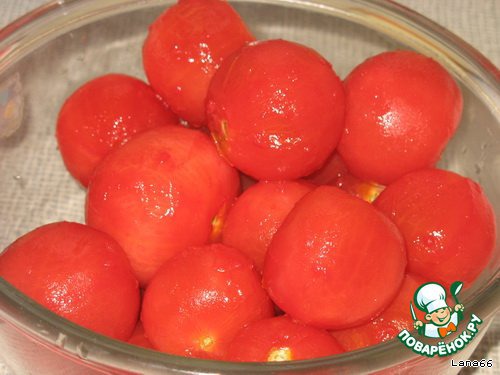 Помидоры ошпарить кипятком, снять с них кожицу.