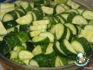 Нарезать огурцы на полудольки.
