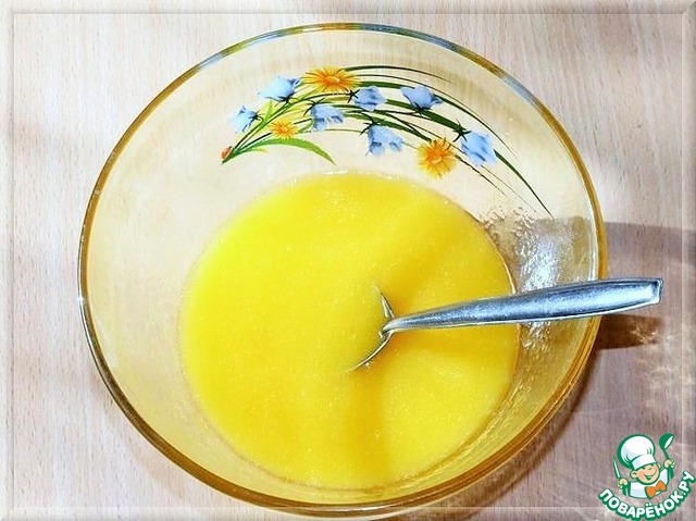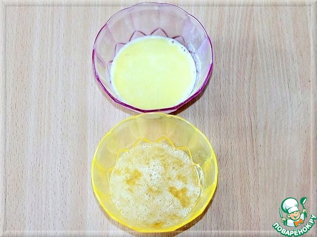 В растопленный и остывший маргарин (100 мл) добавить молоко (100 мл), сахар (75 гр), 2 яйца,
