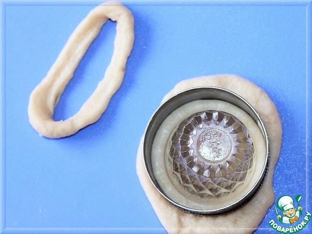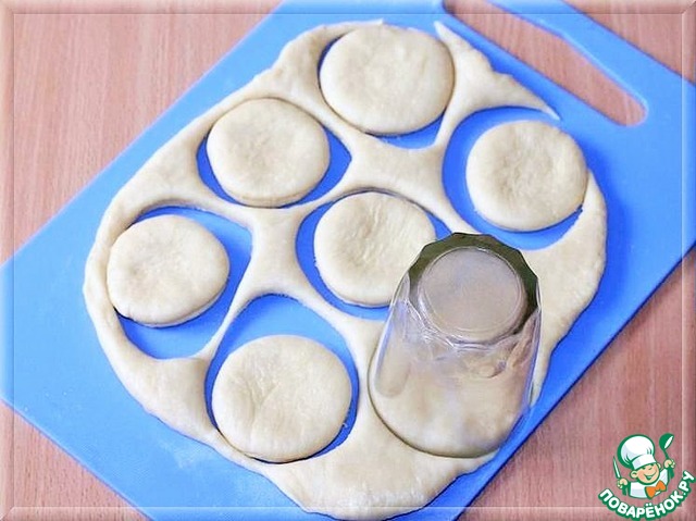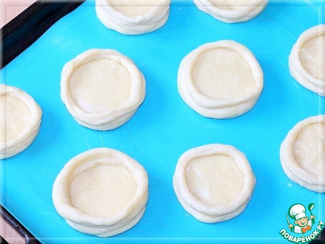 Выкладываем кружочки (6 см) на смазанный маслом противень. Смазываем взбитым белком край круга. Для чего - чтобы хорошо держалось кольцо. На каждый кружок (край) кладем кольцо.