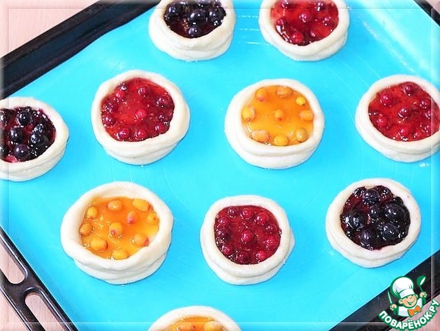 Середину кольца заполняем пюре или густым джемом, повидлом. На пюре, я положила по 1 ст. л. мелких ягод. Смазываем булочки взбитым желтком и даем тесту растояться минут 20. Выпекаете булочки в хорошо разогретой до t 200 С духовке 20 минут, пока не зарумянятся.