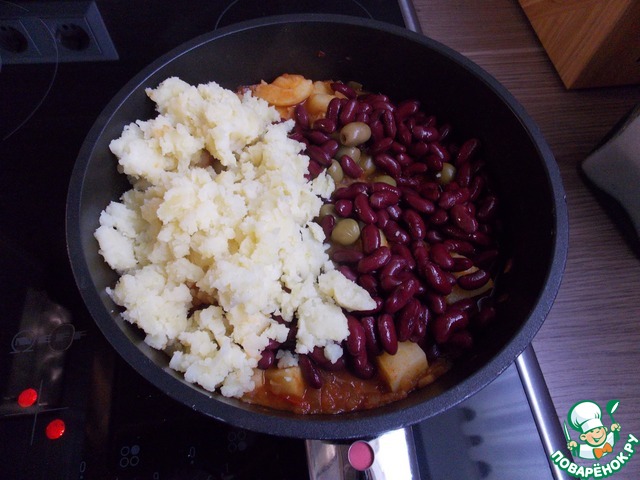 Фасоль промыть и, вместе с половиной картофеля, розмарином, каперсами и цедрой лимона добавить к овощам. Оставшийся картофель размять вилкой и добавить в гуляш. По необходимосте добавьте воды, т. к. Гуляш не должен быть слишком густым или слишком жидким.