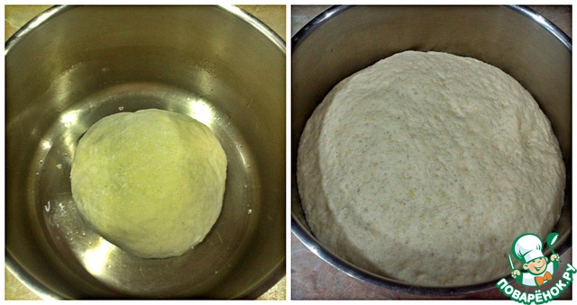 Тесто положить в емкость, смазанную растительным маслом и поставить в тепло на 1 час. Тесто увеличится в три раза.