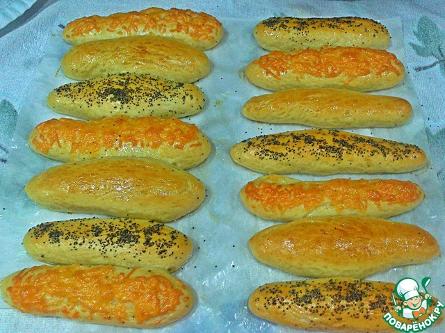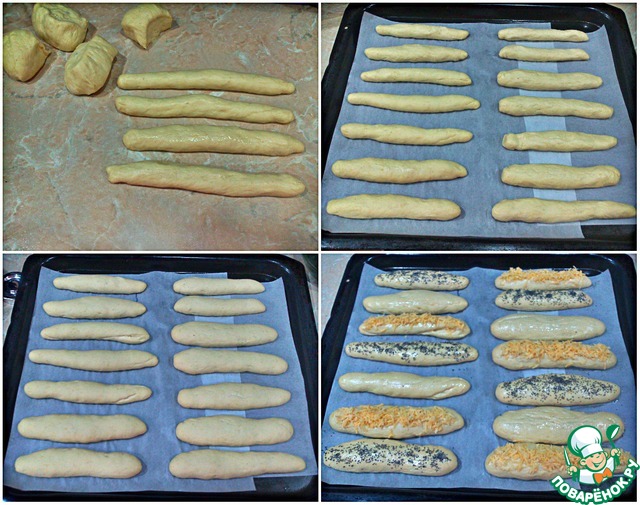 Тесто скатать в жгутик и разрезать на небольшие кусочки, у меня их получилось 14шт. Каждый кусочек скатать в жгутик длиной ~15-17см. Уложить на противень, застеленный пергаментной бумагой и поставить в тепло на 20 минут. Затем каждую палочку обмазать яйцом (+0,25ч. л. сахара для более румяной корочки) и на свой вкус обсыпать палочки. Я для примера присыпала маком, сыром и оставила просто без присыпки. Здесь уже фантазируйте и смотрите, что у Вас есть под рукой. Выпекаем в заранее разогретой духовке 25-30 минут при температуре 180 градусов, ориентируйтесь по своей духовке.