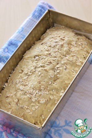Переложить в форму или на противень, смазанные маслом, присыпать хлопьями и поставить на расстойку. У меня это заняло 30 мин. Тесто поднялось где-то на 1см выше формы.