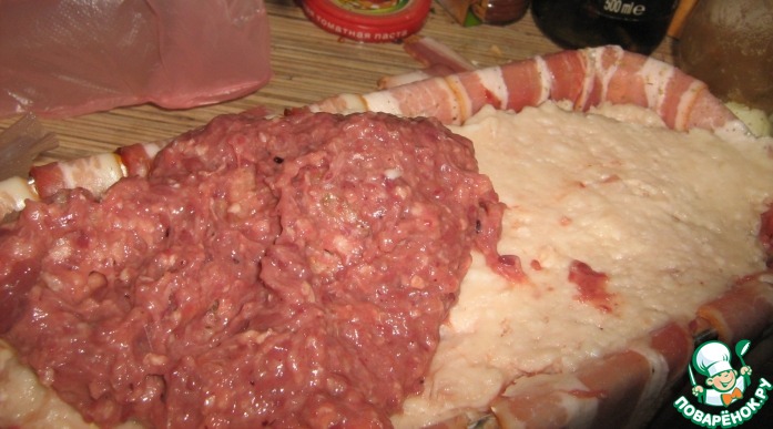 И те "язычки" бекона, что мы свесили из формы, заворачиваем сверху.