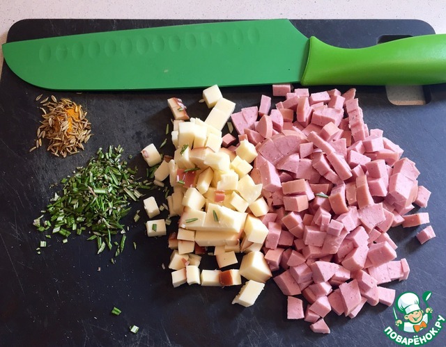 Нарежьте ветчину (колбасу или сардельку) мелким кубиком и сыр так же. Розмарин. Все подготовьте и отставьте в сторону.