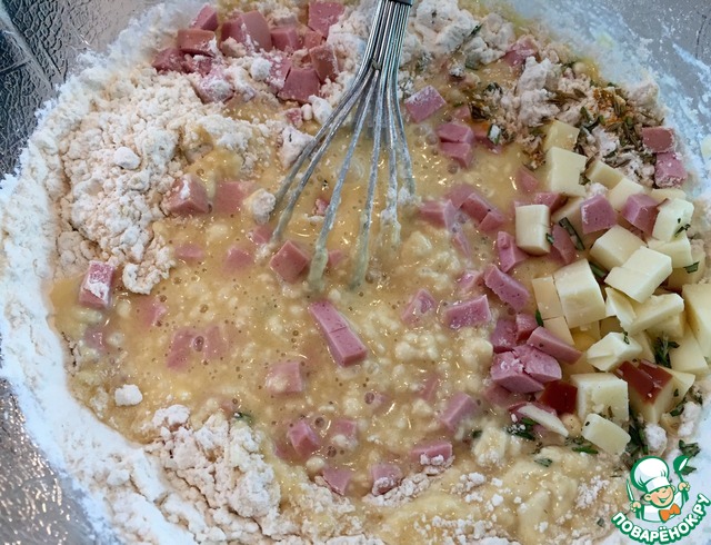 Замесите тесто. Смешайте яйца и молоко, влейте растопленное сливочное масло. Добавьте муку, разрыхлитель и сыр с розмарином и ветчиной!