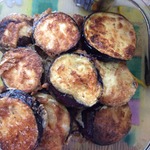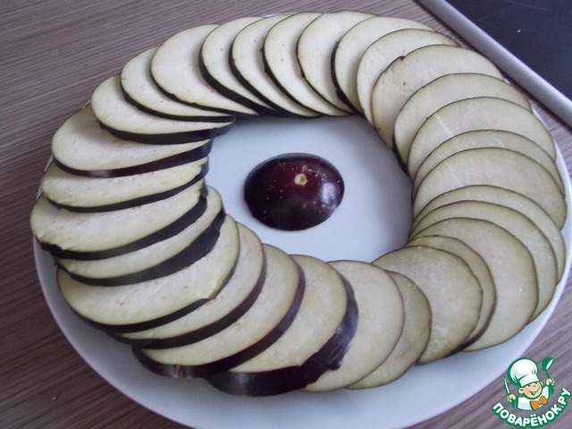 Нарезаем наш баклажан на кружочки толщиной примерно 0.5 см. Солим и оставляем на 10 мин. чтобы ушла горечь. Потом промываем и обсушиваем.
