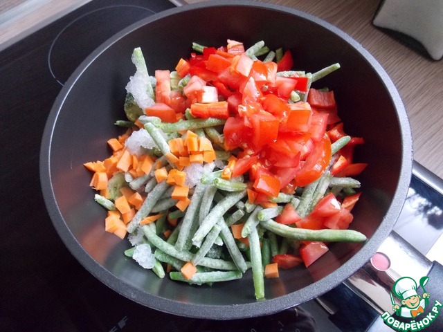 • Берём глубокую сковородку, нагреваем её и высыпаем все подготовленные овощи. Тушить при закрытой крышке на среднем огне. Лед на замороженных овощах через некоторое время при тушении расстает. Переодически не забывайте помешивать.
