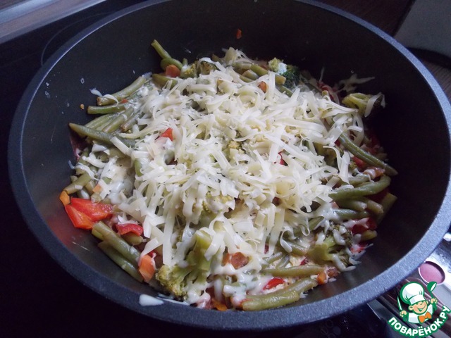 • Омлет побелел и мы можем сразу насыпать сверху тёртый сыр. Закрываем крышку ещё на 1 мин. И всё, готово!
