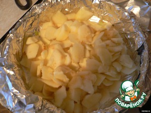 Форму или глубокую сковородку выложите калькой (у меня фольга, которую я терпеть не могу - она плохо потом от выпечки отлипает. Но кальку я опять забыла купить).
