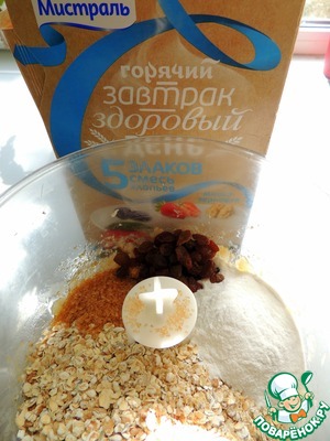 Добавляем хлопья, сахар, муку, изюм.