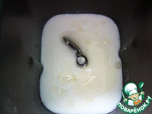 В ведро ХП влить сметану, размешанную с водой (общий объём должен быть 200 мл), растительное масло. Добавить соль, сахар -