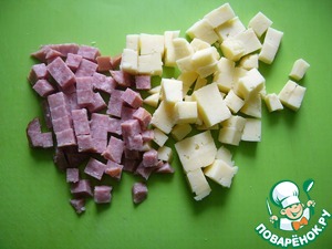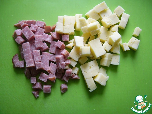 После второго замеса добавить жареный лук, нарезанные маленькими кусочками колбасу и сыр