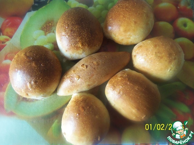 Готовое тесто обмять, выпустив лишний воздух, и сформовать булочки, уложив их на смазанный маслом противень. Накрыть полотенцем и поставить в тёплое место для подъёма на 15-20 минут