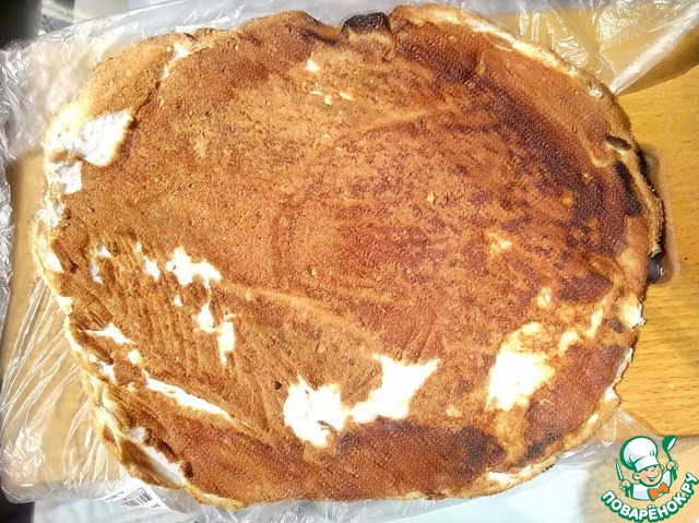 Готовую меренгу вынуть из духовки. Я снимаю таким способом на разделочную доску одеваю полиэтиленовый пакет, кладу эту досточку на меренгу, и переворачиваю (меренговый корж окажется между пергаментом и доской) и уже на доске снимаю пергамент. После этого необходимо остудить меренгу.