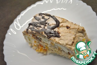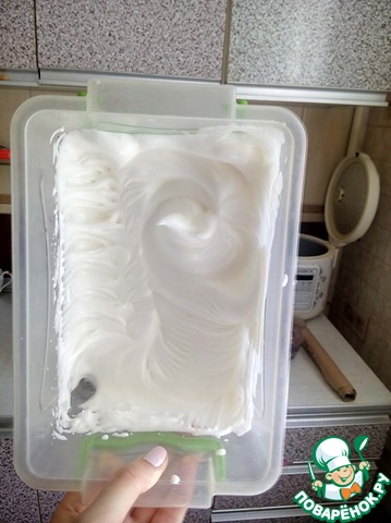 На противень, застеленный пергаментом, выложить взбитые белки и равномерно распределить, формируя прямоугольник толщиной минимум 1,5 см т. к. тонкий слой быстро просушится в духовке и будет ломаться в дальнейшей работе.