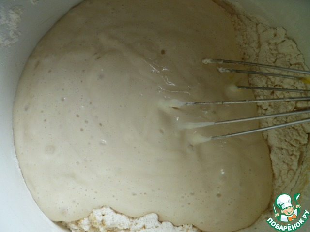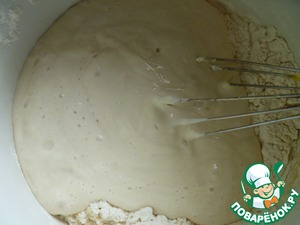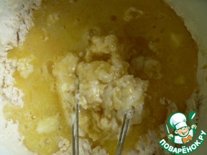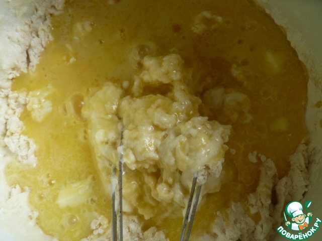 В отдельную посуду просеиваем муку, выливаем половину яично-масляной смеси.