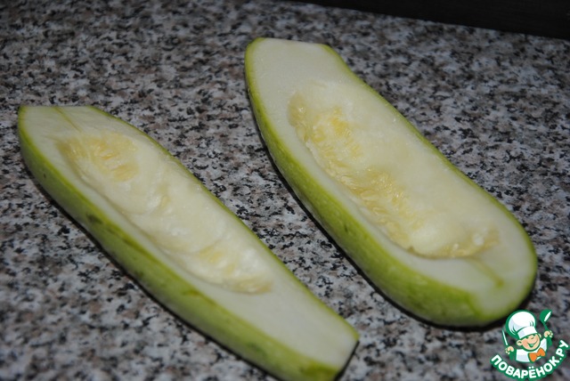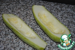 Кабачок помыть, разрезать вдоль, ложкой вынуть сердцевину, положить в микроволновку на 5 минут при максимальной мощности.