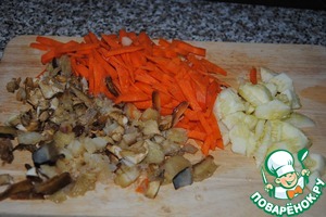 Начинка. Лук мелко порезать, морковь соломкой и пассировать в оливковом масле до прозрачности лука, затем добавить грибы, посолить, поперчить и в самом конце добавить порубленный чеснок.