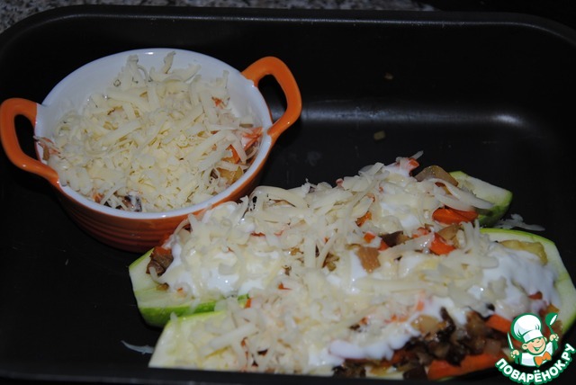 Кабачки выложить на противень, посолить. На дно немного сыра, сверху выложить горкой начинку, полить йогуртом. Сверху посыпать сыром. -