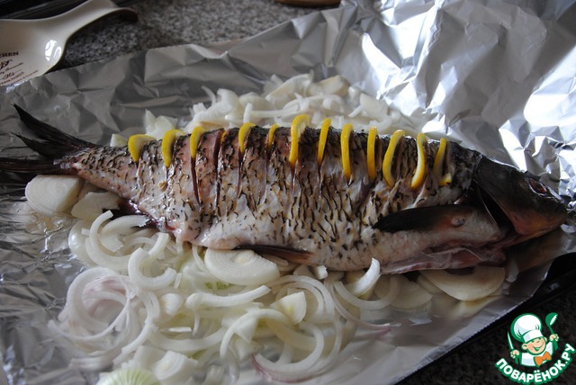 В карман из фольги на дно кладем порезанный полукольцами репчатый лук. На рыбе делаем надрезы до скелета с шагом 1 см с обеих сторон. В каждый надрез кладем лимон, порезанный полукольцами. Солим, перчим и укладываем на подложку из лука.